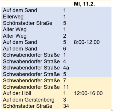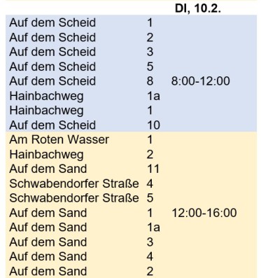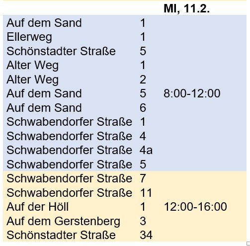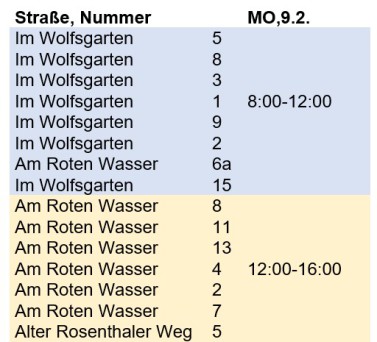 Wir haben für die Montage der Datendosen in den einzelnen Haushalten neue Termine bekommen. Bitte tragen Sie Sorge, dass zu den angegebenen Zeiten Zugang zum Heizungskeller gewährleistet ist. Die Daten haben sich inzwischen geändert: Hier die letzte Version: